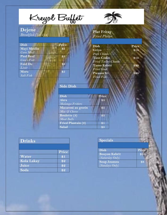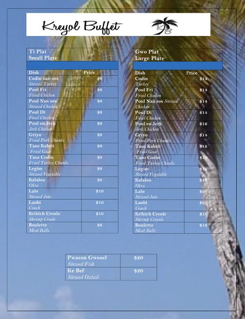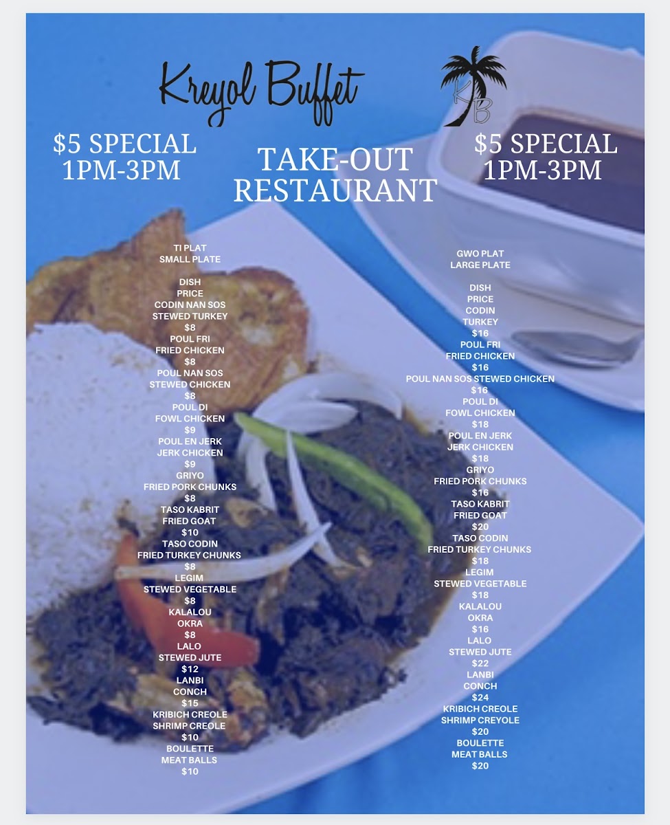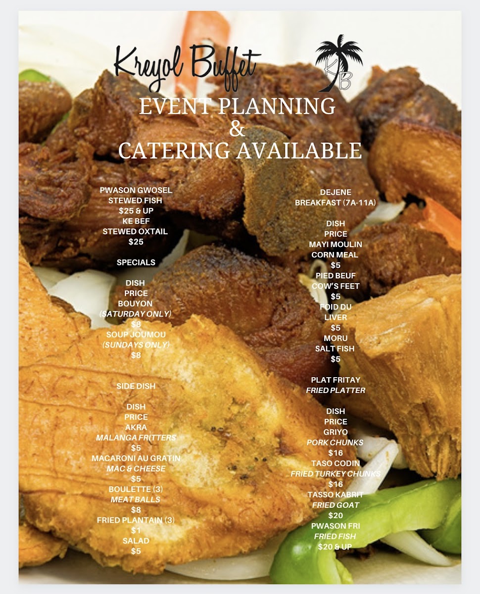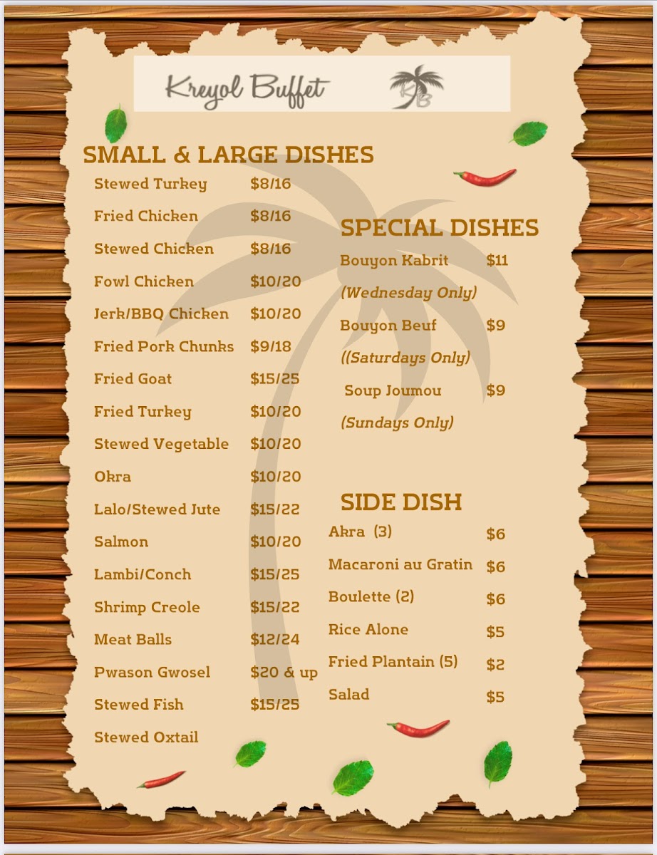 Overall, Kreyol Buffet's menu is a celebration of Haitian and Caribbean cuisine, offering a range of dishes that are rich in flavor, texture, and authenticity. Whether you're in the mood for seafood, poultry, or something more exotic like goat, the variety of options ensures there's something for everyone.