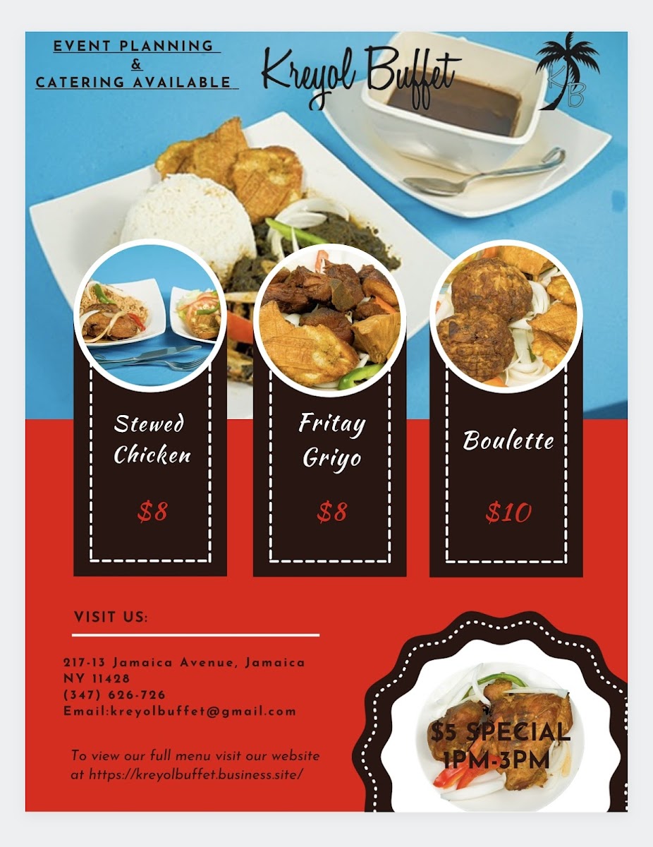 Kreyol Buffet offers a diverse and flavorful menu that caters to a variety of tastes, especially for those who enjoy Caribbean and Haitian-inspired dishes. Among the standout items is the Stewed Fish, a rich and savory dish that's perfect for seafood lovers, with tender fish simmered in a flavorful sauce. For those who prefer poultry, the Poul Fri Fried Chicken is a must-try, offering a crispy exterior and juicy interior, packed with spices that bring out the essence of Haitian cooking.